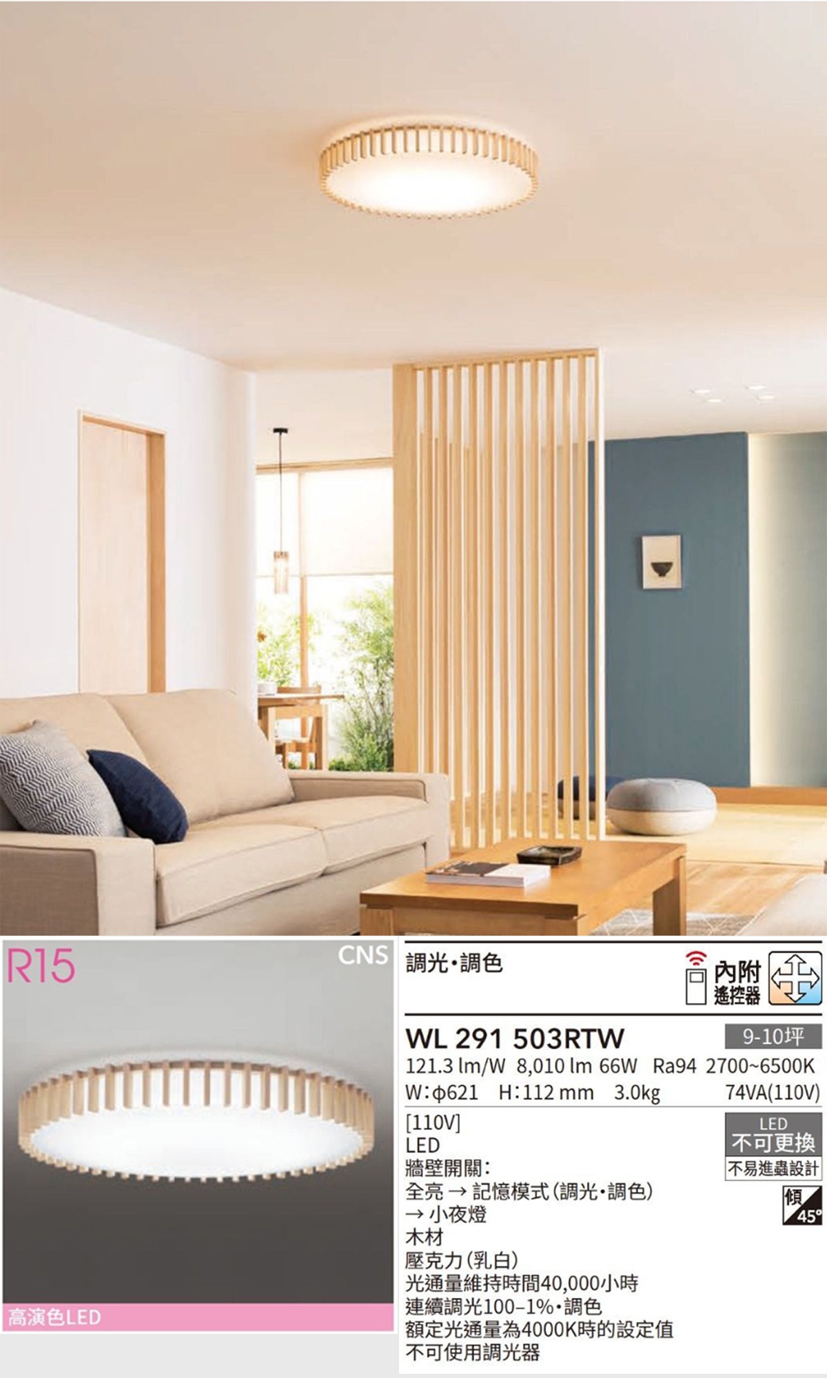 色溫可從 2700K(暖白)到 6500K(冷白) 調整,亮度則可從 1%〜100% 無段調光。透過紅外線遙控器即可輕鬆操作明暗與色溫設定,適用於客廳、臥室等各種生活空間。