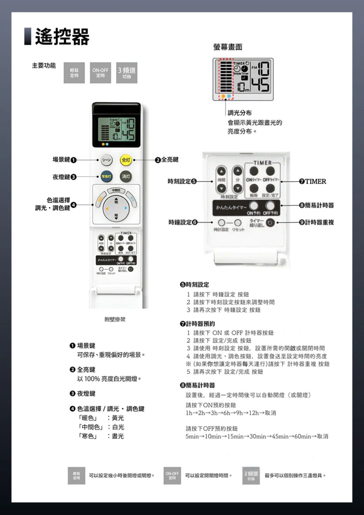色溫可從 2700K(暖白)到 6500K(冷白) 調整,亮度則可從 1%〜100% 無段調光。透過紅外線遙控器即可輕鬆操作明暗與色溫設定,適用於客廳、臥室等各種生活空間。